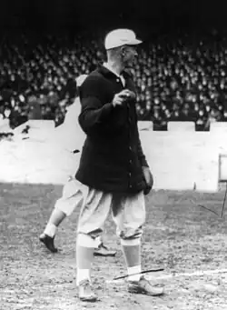 He attended college at Bucknell University, where he served as class president and played on the school's football, basketball, and baseball teams.[3] Mathewson was also a member of the fraternity of Phi Gamma Delta.[4] His first experience of semi-professional baseball came in 1895, when he was 14 years old.[5] The manager of the Factoryville ball club asked Mathewson to pitch in a game with a rival team in Mill City, Pennsylvania.[5] Mathewson helped his hometown team to a 19–17 victory, but with his batting rather than his pitching.[5] He continued to play baseball during his years at Bucknell, pitching for minor league teams in Honesdale and Meridian, Pennsylvania.[6] Mathewson was selected to the Walter Camp All-American football team in 1900. He was a drop-kicker.[7]