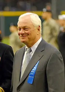 Armstrong worked for several Seattle companies as a consultant from 1989 to 1992, and served as interim athletic director for the University of Washington Huskies, during 1991.[6] In 1991, after Smulyan had put the team up for sale and rumors persisted that they would relocate to the Tampa Bay area, Armstrong was recruited by then-U.S. Senator Slade Gorton to aid in efforts keep the Mariners in Seattle.[3] He served as a consultant to Seattle-area business leader John Ellis while The Baseball Club of Seattle (led by Nintendo chairman Hiroshi Yamauchi) was negotiating to purchase the team. Major League Baseball stipulated that, as a condition of allowing the team's sale to a group with foreign majority investors, "North American interests" were to run the club's day-to-day operations.[7] The sale was approved in June 1992. Armstrong was brought back to serve as the team's president in 1993, with Ellis serving as CEO and representing the team's ownership group (a role filled by former Nintendo of America executive Howard Lincoln since Ellis' retirement in 2000).