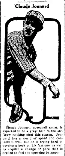 Claude Alfred Jonnard (November 23, 1897 – August 27, 1959) was a professional baseball player. He was a right-handed pitcher over parts of six seasons (1921–1924, 1926, 1929) with the New York Giants, St. Louis Browns and Chicago Cubs. For his career, he compiled a 14–12 record in 137 appearances, most as a relief pitcher, with a 3.79 earned run average and 160 strikeouts. Jonnard was a member of the Giants National League pennant-winning teams in 1923 and 1924, losing both World Series (to the New York Yankees and Washington Senators, respectively). In World Series play, he made three relief appearances, giving up no runs.