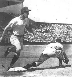 ![]() Conatser (left) during a game on June 3, 1951 at Gilmore Field in Los Angeles, California. | |
