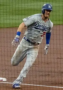 The Dodgers were the first team to clinch a playoff berth in the 2020 season, developing a commanding lead over the NL West by September 16.[80] They finished at the top of their division and went on to sweep the Brewers at the 2020 National League Wild Card Series.[81] From there, the Dodgers faced the Padres in the 2020 NLDS, where Bellinger's defensive play in Game 2 allowed Los Angeles to hang onto their 4–3 lead and take the game. In the seventh inning, with Grisham on second base, Bellinger made a jumping catch to rob Fernando Tatis Jr. of a two-run home run.[82] The 2020 NLCS started with the Dodgers down 3–1 in four games, but they were able to mount a comeback and push the series to seven games. Bellinger scored the go-ahead home run in that final game, clinching the Dodgers' place in the 2020 World Series.[83] There, the Dodgers defeated the Tampa Bay Rays in six games for Bellinger's first World Series championship and the Dodgers' first since 1988.[84] Despite injuring his shoulder during the NLCS, Bellinger continued to play in the World Series, and he celebrated his Game 1 home run by foot-tapping his teammates rather than high-fiving them.[85] After the season, Bellinger signed a one-year, $16.1 million contract with the Dodgers for the 2021 season.[86]
