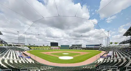 The main stadium is located on the northern portion of the property, immediately south of a proposed elementary and middle school campus.[4] A public plaza along West Villages Parkway is designed to function as an event space when baseball activities are not taking place. Practice and multi-use fields occupy the southern and eastern areas of the approximately 70 to 75 acres (28 to 30 ha) site.[4] The multi-use fields are used for overflow parking during spring training and serve as public recreation space for local schools and tournaments. The team's sports medicine, fitness, and physical therapy facilities are also located within the complex.[4]