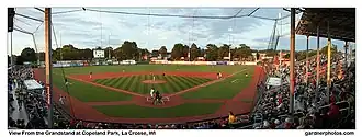 Copeland Park, also referred to as "The Lumber Yard", is a stadium in La Crosse, Wisconsin, US. It is primarily used for baseball and is the home field of the La Crosse Loggers baseball team. The current stadium was built in 2003, although a substantially smaller baseball diamond existed at the site before the construction of the new ballpark. At the time of its construction, the stadium held approximately 2,000 people.[1] However, the success of the Loggers prompted expansions to the grandstand, bringing the capacity to its current 3,550 people.[2] The field dimensions are 325 ft. to left field, 365 ft. to center, and 315 ft. to right.