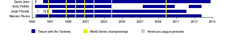 The Core Four won four World Series Championships together in five years.[54] They won seven American League pennants together from 1996 to 2009.