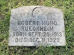 Cracker Jack's mascots Sailor Jack and his dog Bingo, drawn by Andrew Loomis, were introduced as early as 1916[11] and registered as a trademark in 1919.[12] Sailor Jack was modeled after Frederick’s grandson Robert Rueckheim. He was the son of Edward, the eldest of the Rueckheim brothers. Robert died of pneumonia shortly after his image appeared at the age of 7.[13] The sailor boy image acquired such meaning for the founder of Cracker Jack that he had it carved on his tombstone at St. Henry Catholic Cemetery in Chicago; the image, an inset in the stone, is missing.[13]