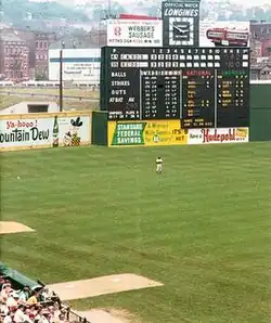 - The scoreboard in left-center field was a major impediment to home-run hitting. At 55 ft (16.8 m) tall, and entirely in play (yellow lines appeared on walls many years later), many hits that would be home runs anywhere else became two-base hits, bouncing back to the outfielder. A sign to the right side of the clock at the very top of the scoreboard offered a free suit from a local tailor to any Reds player to hit the sign. Small consolation for a near miss on a home run.