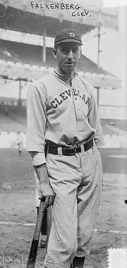 On July 23, 1908, the Cleveland Naps of the American League purchased Falkenberg and Dave Altizer from the Senators for $10,000 ($349,963 in current dollar terms).[35] He continued to pitch for Cleveland through 1911. He missed time during the 1911 season due to illness[1] and a broken thumb.[36] After the 1911 season, Harry Davis became Cleveland's manager, and he released Falkenberg to the Toledo Mud Hens of the American Association.[37] With Toledo in 1912, Falkenberg played with Earle Gardner, who had learned how to throw the emery ball from Russ Ford. Gardner taught the pitch to Falkenberg.[1] Falkenberg had a 25–8 win–loss record in 1912, leading the American Association with a .758 winning percentage.[38] Cleveland purchased Falkenberg from Toledo before the 1913 season.[1] He won his first 10 games of the season,[39] and finished the year with a 23–10 win–loss record and a 2.22 ERA,[1] the second-most wins and eighth-best ERA in the American League. He led the American League with 13 wild pitches in 1913.[40]
