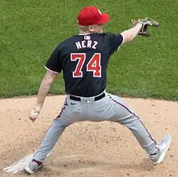 On November 14, 2023, the Nationals added Herz to their 40-man roster to protect him from the Rule 5 draft. He was optioned to the Triple–A Rochester Red Wings to begin the 2024 season.[13] On June 4, 2024, Herz was promoted to the major leagues for the first time.[14] Herz recorded his first major league win in his third start, defeating the Marlins on June 15. With the start, he became the first pitcher since Stephen Strasburg, and the second since 1901, to record 13 strikeouts without walking a batter in one his first three major league appearances.[15] In 19 starts during his rookie campaign, Herz compiled a 4-9 record and 4.16 ERA with 106 strikeouts across 88+2⁄3 innings pitched.