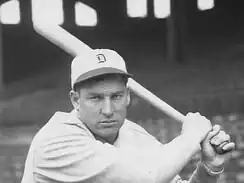 On December 5, 1928, the Detroit Tigers purchased Alexander and pitcher Augie Prudhomme from Toronto for $100,000 cash and three players to be named later.[7] In 1929, Alexander won the first base job with the Tigers, starting 155 games at the position. He compiled a .343 batting average, scored 110 runs, and led the American League with 215 hits. He also ranked among the American League leaders with 83 extra base hits (second), 363 total bases (second), 137 RBIs (third), 25 home runs (fifth), a .580 slugging percentage (fifth), 43 doubles (fifth), and 15 triples (fourth).[1] After a tremendous rookie season, comparisons to Babe Ruth continued with one writer even dubbing him the "Prince of Swat".[3][8][9]