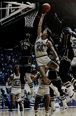 Ainge played college basketball at Brigham Young University (BYU) in Provo, Utah. He hit one of the best-known shots in the 1981 NCAA tournament, against Notre Dame in Atlanta in the Sweet Sixteen, when his coast-to-coast drive and lay-up with two seconds remaining gave the Cougars a one-point win.[8][9][10] Ainge concluded his senior year by winning the Eastman Award, as well as the John R. Wooden Award—given to the best collegiate player in the nation. During his four-year career at BYU, Ainge was an All-American, a two-time First Team Academic All-American, the WAC Player of the Year and a four-time All-WAC selection. He concluded his college career having scored in double figures in 112 consecutive games, an NCAA record at that time.