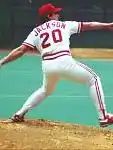 A key member of the World Series winning Royals in 1985, Jackson made one of the most important starts in Royals history in the ALCS. Trailing the Blue Jays three games to one and facing elimination, Jackson tossed a complete-game shutout and kept the Royals alive. Two weeks later, in the World Series, Jackson again took the ball with the Royals trailing three games to one in a Game Five, and again Jackson led the Royals to a crucial victory over the St. Louis Cardinals. In the seventh inning of that game, he pitched, as of 2023, the only immaculate inning in World Series play; his victims were Terry Pendleton, Tom Nieto and Brian Harper. Jackson's 1.04 post-season ERA with the Royals is the lowest in team history (min 10 IP). The Royals went on to win the World Series in seven games. After disappointing seasons in 1986 and 1987, Jackson was traded along with Ángel Salazar to the Cincinnati Reds in exchange for Ted Power and Kurt Stillwell.[3]
