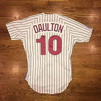 The Philadelphia Phillies selected Daulton in the 25th round of the 1980 Major League Baseball draft.[2] On September 25, 1983, he made his major league debut for the Phillies. Daulton had three at bats for the Phillies in 1983.[3] Through 1988, he played sparingly, due chiefly to the presence of all-star catchers Ozzie Virgil Jr. and Lance Parrish. Daulton became the Phillies' full-time catcher in 1989.[4] Throughout his early career, his primary value to the team was as a defensive catcher — his cumulative batting average of .206, through the 1988 season, was barely above the Mendoza Line — and he never appeared in as many as 60 games, in any single season. Daulton's breakout season was 1990, his first as his team's primary backstop; that year, he batted .268, with 57 runs batted in (RBI) — which, when coupled with his skills behind the plate, earned him a three-year contract worth $6.75 million.[5] Daulton caught Terry Mulholland's no-hitter, on August 15, 1990.[6]