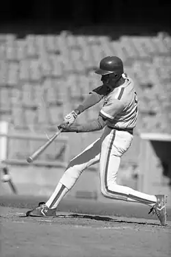 Employing a distinctive batting stance with a high leg kick, Strawberry rose through the Mets system and reached the major league level in 1983, posting 26 home runs, 7 triples, and 74 runs batted in, while hitting for a .257 average.[12] He was named the National League's Rookie of The Year.[12][13] In 1984, he made it to the All-Star game for the first of 8 consecutive appearances (the first 5 as a starter), and he once again hit 26 home runs, this time driving in 97 runs.[12]