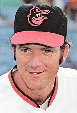 McNally hit a home run against Tom Murphy on June 9, 1970, and held the Angels to three runs over seven innings, but the bullpen gave up some additional runs as the Orioles lost 7–5.[53] On June 21, McNally pitched into the ninth inning before being replaced by Pete Richert, limited Washington to two runs, and won his 100th career game as the Orioles defeated the Senators 4–2.[54] He made the All-Star team for the second year in a row, picked by Weaver, who was managing the team.[55] McNally had a 12–7 record and a 4.38 ERA on July 18, but he posted a 1.96 ERA for the remainder of the season and went 12–2, with the Orioles winning 14 of the 17 games he appeared in thereafter.[56] From July 26 through August 29, he won nine consecutive games.[56] On August 21, 1970, McNally threw a shutout in a 5–0 victory over the Angels.[57] Four days later, he allowed 10 hits in a complete game against the Athletics, but only one run, and he picked up his 20th win of the season as Baltimore defeated Oakland by a score of 5–1.[58] On August 29, he gave up only one run in a complete game, 6–1 victory over the Milwaukee Brewers; the run was unearned.[59] During the 1970 season, the Orioles never lost more than two straight games in which Palmer, Cuellar, and McNally started. The two times they lost two games in a row, it was McNally who ended the streak.[31] McNally's 24 wins at the end of the year tied with teammate Cuellar and Jim Perry for the AL lead. McNally ranked seventh with 185 strikeouts, tied with four others for the lead with 40 starts, and ranked fourth with 296 innings pitched.[60] After the season, he finished second to Jim Perry in AL Cy Young Award voting and ranked 16th in AL MVP voting.[12][61]