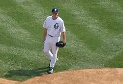 Cone recognized after the 2000 season that his tenure with the Yankees was over.[46] In 2001 Cone pitched for the rival Boston Red Sox, performing with mixed but mostly positive results, including a 9–7 win–loss record and a 4.31 ERA. His 2001 season included a suspenseful 1–0 loss against Yankees ace Mike Mussina wherein Cone pitched 8+1⁄3 innings giving up one unearned run, keeping the game close even as Mike Mussina came within one strike of completing a perfect game, which would have made Cone the first pitcher to pitch a perfect game and be the losing pitcher in another.[47][48][49]