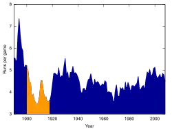 Dead-ball era runs scored per game (highlighted area, 1900–1918 inclusive)