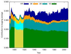 Dead-ball era slugging average (highlighted area, 1900–1918 inclusive) and contributions from (top to bottom) home runs (HR), triples (3B), doubles (2B), and singles (1B)