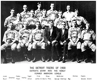 The Tigers were established as a charter member of the now major league American League in 1901.[20] They played their first game as a major league team at home against the Milwaukee Brewers on April 25, 1901, with an estimated 10,000 fans at Bennett Park.[17][21] After entering the ninth inning behind 13–4, the team staged a dramatic comeback to win 14–13.[21] The team finished third in the eight-team league.[22]