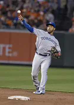 On November 12, 2014, Travis was traded to the Toronto Blue Jays for outfielder Anthony Gose.[12] In early 2015 he was named the sixth best second base prospect in baseball,[13] as well as the number nine prospect in the Blue Jays' organization by MLB.[14] After a strong performance in spring training, Travis was announced as the Blue Jays' starting second baseman on March 31, 2015.[15] Travis debuted on April 6 and recorded his first career hit, a solo home run off Chasen Shreve of the New York Yankees. He also recorded two walks and scored two runs as the Blue Jays won 6–1.[16] On April 12, Travis hit a three-run double to help the Blue Jays win 10–7 against the Baltimore Orioles. The hit was initially ruled an error on Travis Snider, however the call was changed on April 16, and Travis was credited with a hit and three RBIs.[17]