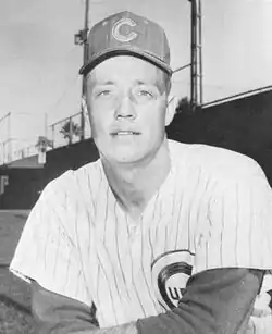 Bertell found himself in a platoon role with the Cubs in 1961, seeing the majority of the playing time (92 games) behind the plate for the hapless Cubs.[1] He hit his first major league home run on July 6 off Pittsburgh's Vinegar Bend Mizell, and, overall, had a decent season at the plate for a catcher. Bertell hit .273 with two home runs and 33 RBI.[1] However, his playing time decreased the next season as the Cubs again stumbled to a ninth-place finish in the National League. In 77 games, he posted a career-best batting average of .302 with two home runs and 18 RBIs, and despite playing in fewer than half the team's games, Bertell still played more innings at catcher than anyone else on the 1962 team.[1]