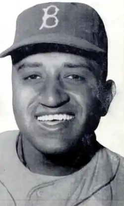 Newcombe debuted for Brooklyn on May 20, 1949, becoming the third African American pitcher in the major leagues, after Dan Bankhead and Satchel Paige.[4] Effa Manley, business manager for the Eagles, agreed to let the Dodgers' Branch Rickey sign Newcombe to a contract. Manley was not compensated for the release of Newcombe.[6]: p.288 He immediately helped the Dodgers to the league pennant as he earned seventeen victories, led the league in shutouts, and pitched 32 consecutive scoreless innings.[7] He was also among the first four black players to be named to an All-Star team, along with teammates Jackie Robinson and Roy Campanella and the Indians' Larry Doby. Newcombe was named Rookie of the Year by both The Sporting News and the Baseball Writers' Association of America.[4] In 1950, he won 19 games, and 20 the following season, also leading the league in strikeouts in 1951.[8] In the memorable playoff game between the Dodgers and the Giants at the end of the 1951 season, Newcombe was relieved by Ralph Branca in the bottom of the ninth inning when Clyde Sukeforth instructed manager Chuck Dressen to bring in Branca. Branca then surrendered the walk-off home run to Bobby Thomson to give the Giants the pennant.[9]