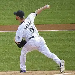 The Rockies invited Butler to spring training in 2014.[12] They assigned him to Tulsa to start the 2014 season,[13] and he started Tulsa's season opener.[14] After he pitched to a 2.49 ERA with 40 strikeouts and 19 walks in 68+2⁄3 innings pitched, the Rockies promoted Butler to the major leagues for his debut on June 6.[15] He recorded a loss in his first start, pitching 51⁄3innings and giving up 6 runs on 10 hits.[16] He was placed on the disabled-list before his next scheduled start with right shoulder inflammation, and he was replaced by Tyler Matzek, who would be the third starting pitcher to debut for the Rockies in six days, along with Butler and Christian Bergman.[17]