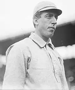 Plank made his major league debut for the Athletics on May 13, 1901. As a rookie, Plank pitched well,[7] posting a 17–13 win–loss record with a 3.31 earned run average (ERA) and 28 complete games in 32 games started. He won 20 games for the first time in his career in 1902, posting a 20–15 record and a 3.30 ERA as the Athletics won the American League (AL) pennant. Only Rube Waddell won more games that year for the Athletics, as Mack pointed out.[7] He won 23 games in 1903 while leading the AL in games started.[1] In 1905, Plank made his first trip to the World Series. He faced Christy Mathewson in the first game and Joe McGinnity in the fourth game. Though Plank gave up only three runs in 17 innings during the series, the Athletics lost to the New York Giants in five games and did not score an earned run in the entire series.[8] The Athletics returned to the World Series in 1910, but Plank was forced to sit out with a sore arm, although newspapers were speculating that he would pitch during the series.[9][10]
