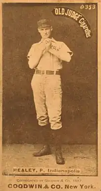 Healy was purchased by the Indianapolis Hoosiers on March 8, 1887.[1] That season, he was the ace of the Indianapolis pitching staff[4] and finished with a record of 12–29. His 29 losses were the most of any pitcher in the NL.[1] Healy also went on an "around-the-world" tour with other American baseball players that year, playing exhibition games in Europe, Asia, and Australia. When Healy returned home, the mayor of his hometown honored him with "a special ceremony and a pin."[5]