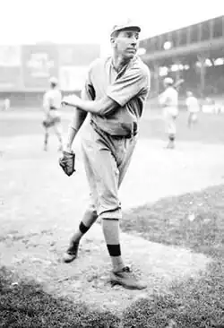 Rixey joined the Phillies for the 1912 season without playing a single game of minor league baseball.[6] His time with the Phillies was marked by inconsistency. He went 10-10 in his first year, with a 2.50 earned run average (ERA) and 10 complete games in 23 games pitched.[7] He had a three hit shutout against the Chicago Cubs on July 18.[8] Rixey was on the losing end of a no-hitter by Jeff Tesreau on September 6.[9] After the season, the Chicago Cubs, under new manager Johnny Evers, offered a "huge sum" to the Phillies for Rixey, but manager Red Dooin declined the offer.[10] Prior to the 1913 season, Rixey notified the Phillies of his desire to finish his studies at the University of Virginia and graduate in June; however, after some negotiation, he decided to sign a contract and re-joined the team shortly after the season began.[11] That season, he appeared in 35 games, started 19 of them, winning nine games, and had a 3.12 earned run average. In 1914, his record worsened to 2–11, and his earned run average increased to 4.37.[7] Rixey's record improved to 11–12 in 1915, and his earned run average was 2.39 as the Phillies won the National League pennant and played the Boston Red Sox in the 1915 World Series. During Game 5 of the series, Rixey replaced starter Erskine Mayer for the final six innings of the game. He allowed three runs in the final two innings and lost 5–4.[12]