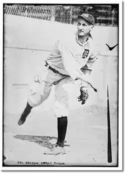 Erickson was the second player born in Sweden to play in the major leagues. Erickson was a right-handed pitcher who debuted with the Giants in 1914. Erickson pitched in only one game for the Giants, going five innings and giving up seven runs, though none were earned. In 1916, the Detroit Tigers gave Erickson a second chance, and he played parts of three seasons in Detroit, never having a winning season. He was traded to the Senators in 1919 and had his best seasons there. In 1919, as a teammate of Walter Johnson, Erickson led the American League in strikeouts per nine innings with 5.52, though he also was among the league leaders in hit batsmen and wild pitches. In 1921, Erickson was among the league leaders in ERA (3.62), strikeouts per nine innings (3.57), shutouts (3) and hit batsmen (11).[3]