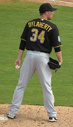 O'Flaherty's main weapon was a sinker in the low 90s that he threw about half the time. He complemented the sinker with a four-seam fastball, a slider in the mid 80s, and a changeup in the mid 80s. His pitch selection did not vary greatly between right-handed and left-handed hitters, although lefties tended to see fewer sinkers and more sliders. O'Flaherty often favored the slider when he was ahead in the count.[25]