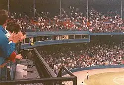 On December 19, 1990, the Tigers and WJR announced that the station wanted to go in a "new direction" and that the 1991 season would be Harwell's last, as his contract was "non-renewed".[6] Carey then announced that he had already planned to retire after the 1991 season and that the decision was unrelated to Harwell's contract situation. Fans across Michigan and throughout the baseball world were outraged, but the ballclub and the radio station (who eventually wound up blaming each other for the decision) stood firm: "[Harwell's situation is] not going to change no matter how much clamor is made over it," said team president Bo Schembechler. The situation caused outrage so much that some made threats of violence against Schembechler. Some, such as Mitch Albom, blamed the situation for causing as much negative feeling as it did on WJR executive Jim Long who was the one who pushed the quick, no severance pay removal of Harwell.[7] The movement in favor of keeping Harwell was so strong that even billboards in favor of his remaining were put up.[8] Rick Rizzs was hired away from the Seattle Mariners to replace Harwell in 1992, teaming with Bob Rathbun.