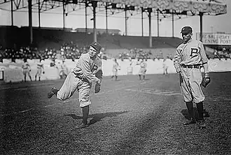 1915 was a successful year both for Mayer and for the Phillies. Mayer recorded 21 wins (3rd in the National League), 20 complete games, a .583 won-loss percentage (10th in the league), 114 strikeouts (9th in the league), and a 2.36 earned run average.[7] Meanwhile, the Phillies won their first ever National League pennant with a 90-win season. Unfortunately for Mayer, the Phillies lost the 1915 World Series to the Boston Red Sox. Mayer started two games in that Series, and lost in his only decision. Mayer's first start came in Game 2; it marked the first time a Jewish player had appeared in a World Series game.[9] Woodrow Wilson, then President of the United States, attended the game, the first time a United States President attended a World Series game.[10]