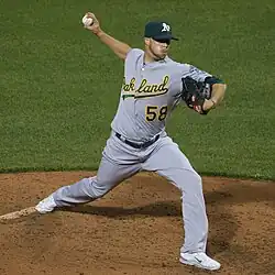 ![]() Scribner pitching for the Oakland Athletics in 2015 | |