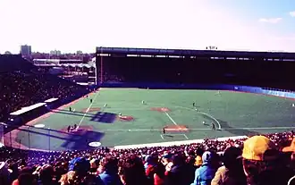 Exhibition Stadium was the fourth stadium to be built on its site since 1879.[1] When the original grandstand was lost due to a fire in 1906, it was quickly rebuilt.[1] A second fire destroyed the stadium in April 1946, which led to the city constructing a covered north-side grandstand (known as CNE Grandstand) for CA$3.5 million in 1948.[7][8][9][10][11] This part of the stadium's structure stayed even as the stadium underwent various changes to its configuration over the years until its 1999 closure.