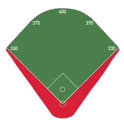 Moreover, at the time of the renovation a Canadian football field was almost 34% larger than an American football field.[note 1] While in some respects the larger Canadian field arguably made retrofitting for baseball somewhat easier than was the case south of the border with previous examples such as Los Angeles Memorial Coliseum or future examples such as Mile High Stadium, it nevertheless left many of the seats down the right-field line and in right-centre extremely far from the infield; they actually faced each other rather than the action. Some seats were as far as 820 feet (250 m) from home plate — the largest such distance of any stadium ever used as a principal home field in the major leagues.[26] The Blue Jays realized early on that these seats were too far from the field to be of any use during the regular season. As such, they were only sold when necessitated by demand during the 1985 and 1987 pennant races, as well as the 1985 American League Championship Series.