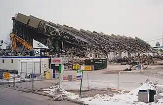 Seven months later, in June 1983, Premier Davis formally announced that a three-person committee would look into the feasibility of building a domed stadium at Exhibition Place. The committee consisted of Paul Godfrey, Larry Grossman and former Ontario Hydro chairman Hugh Macaulay.[36] That same year, the city also studied a number of potential sites for the new domed stadium, and in April 1984, CN agreed to donate 7 acres (2.8 ha) of land near the CN Tower for the stadium; groundbreaking began in October 1986, and the stadium, which would take on the name SkyDome (now Rogers Centre), opened in June 1989.[37] It was intended that the Blue Jays would play at Exhibition Stadium for the last time in 1988, and that the SkyDome would be ready in time for Opening Day in April 1989. However, due to construction delays caused in part by widespread construction worker strikes across Ontario, this was postponed and the Blue Jays began their season at Exhibition Stadium before moving to the SkyDome in June.[38]