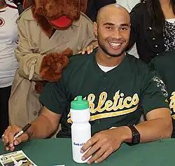 On May 20, 2011, after just 6 innings pitched in 5 appearances in Triple-A, De los Santos received his first major-league promotion to the Athletics when Brandon McCarthy and Tyson Ross were placed on the disabled list.[2] However, since both injured pitchers were in the team's starting rotation, De los Santos was sent back down again four days later without having made an appearance to make room for the promotion of a starter, Guillermo Moscoso, briefly becoming a phantom ballplayer.[3] On June 3, de los Santos was again called up to the Athletics when Grant Balfour, another reliever, was placed on paternity leave.[4] In his major-league debut on June 4, de los Santos faced one batter, the Red Sox's Jed Lowrie, and struck him out.[5] In his second appearance, though, de los Santos gave up a hit and then two wild pitches in the same at bat, allowing a run in one inning.[6] In an unexpected move, the Athletics decided to keep de los Santos with the team when Balfour returned from leave, because their bullpen had been depleted in the previous night's 14-inning game, designating backup infielder Andy LaRoche for assignment instead.[7]