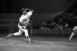 Valenzuela peaked from 1981 to 1986, when he was named a National League (NL) All-Star in each season. He won an NL-leading 21 games in 1986, when he was a runner-up to Mike Scott of the Houston Astros for the Cy Young Award.[2] Valenzuela was also one of the better hitting pitchers of his era. He had ten career home runs and was occasionally used by Los Angeles Dodgers manager Tommy Lasorda as a pinch-hitter.[3] In 1986, he signed the then-largest contract for a pitcher in baseball history ($5.5 million/3 years).[4] However, nagging shoulder problems diminished the remainder of his Dodgers career.[5] He was on the Dodgers' 1988 World Series championship team, but sat out the postseason with a shoulder injury. Valenzuela threw a no-hitter in 1990 before the Dodgers released him prior to the 1991 season. He spent the rest of his major league career with the California Angels, Baltimore Orioles, Philadelphia Phillies, San Diego Padres, and St. Louis Cardinals, before pitching a couple of seasons in Mexico in his 40s.