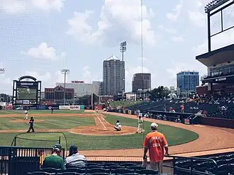 The ballpark opened in 2005 as First Horizon Park. Memphis, Tennessee-based First Horizon National Corporation was awarded the naming rights on December 7, 2004, for 10 years.[13] On November 7, 2007, it was formally announced that locally based NewBridge Bank had acquired the ballpark's naming rights, after First Horizon National Corporation ended their agreement with the Grasshoppers.[14] The deal was originally through the 2017 season.[15] However, Yadkin Bank's acquisition of NewBridge Bank resulted in a name change for the ballpark, effective in the 2016 season.[16] FNB Corporation of Pittsburgh made an offer for Yadkin Bank in 2016.[17] The team and FNB Corporation announced March 6, 2017, that First National Bank will continue the NewBridge sponsorship, and the stadium's new name for the 2017 season would be First National Bank Field.[18]