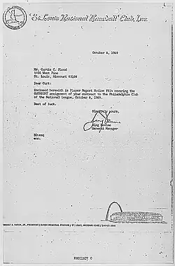 Early one morning in October 1969, a sportswriter notified Flood that he, Tim McCarver, Joe Hoerner, and Byron Browne had been traded to the Philadelphia Phillies in exchange for Dick Allen, Cookie Rojas, and Jerry Johnson.[113] Shortly afterwards, he received the official phone call from Jim Toomey,[113] an executive for the Cardinals that he later referred to as "a middle-echelon coffee drinker in the front office".[114][115] After hanging up the phone, Flood began to cry, and he spent the remainder of the day waiting for another call with more information.[116]