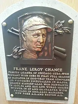 After falling short of induction in the Baseball Hall of Fame by seven votes in 1945,[60] Chance was elected to the Hall of Fame in the 1946 balloting by the Veterans Committee. Tinker and Evers were elected the same year.[61][62] Chance was also elected to the Fresno County Athletic Hall of Fame's first class, in 1959.[63][64]