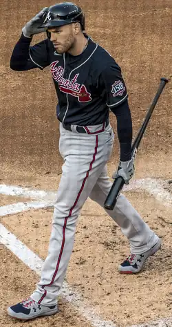Frederick Charles Freeman (born September 12, 1989) is a Canadian and American professional baseball first baseman for the Los Angeles Dodgers of Major League Baseball (MLB). Freeman made his MLB debut with the Atlanta Braves in 2010 and played with them for 12 seasons. After the Braves won the 2021 World Series over the Houston Astros, Freeman entered free agency and signed a six-year, $162 million contract with the Dodgers.
