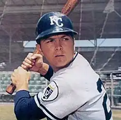 Patek was traded along with Bruce Dal Canton and Jerry May from the Pirates to the Royals for Jackie Hernández, Bob Johnson and Jim Campanis at the Winter Meetings on December 2, 1970.[3] In his first season with the Royals, Patek hit for the cycle on July 9, 1971, and led the American League with 11 triples to finish sixth in A.L. M.V.P. balloting. He earned his first of three All-Star selections the following season,[4] and was a staple of the Royals line-up that won the American League West from 1976 through 1978. He led the American League with 53 stolen bases in 1977. For 8 consecutive years, Patek posted 30 or more stolen bases and he led the American league in double plays turned 4 straight years. A memorable image was captured by NBC television of Patek sitting painfully alone in the Royals' empty dugout[5] while the New York Yankees celebrated on-field their come-from-behind victory to win the last game of the 1977 American League Championship Series, played in Kansas City on Patek's 33rd birthday. The game and series ended when Patek grounded into a double play.[6] He was the starting shortstop for the American League in the 1978 All-Star Game.[7][8]