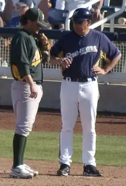 ![]() Iorg coaching first base for the Milwaukee Brewers | |