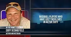 In the 1990s he began work as a baseball historian and focused on the history of baseball during World War II. In 2000, he created the Baseball in Wartime website and launched a monthly Baseball in Wartime e-Newsletter in 2007. He was instrumental in arranging an announcement at every minor league ballpark on Memorial Day 2008 honouring the players who served during World War II and those who were killed in the war. Bedingfield is also the author of articles and three books about the history of baseball during the Second World War.[1] Bedingfield maintains the only online biographical database of professional baseball players who were killed during World War II (there are currently 167 names in the database). In 2012, Bedingfield launched the "Baseball's Greatest Sacrifice" website dedicated to baseball players who lost their lives in military service. In 2007 Bedingfield was the keynote speaker at the When Baseball Went to War conference at the National World War II Museum in New Orleans.[1]