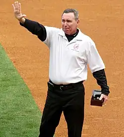 ![]() An emotional Monahan receiving his 2009 World Series ring on April 13, 2010 | |
