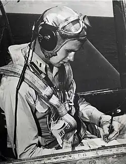 On his 18th birthday, immediately after graduating from Phillips Academy, he enlisted in the United States Navy as a naval aviator.[14] After a period of training, he was commissioned as an ensign in the Naval Reserve at Naval Air Station Corpus Christi on June 9, 1943, becoming one of the youngest pilots in the Navy.[15][c] Beginning in 1944, Bush served in the Pacific theater, where he flew a Grumman TBM Avenger, a torpedo bomber capable of taking off from aircraft carriers.[20] His squadron was assigned to the USS San Jacinto as a member of Air Group 51, where his lanky physique earned him the nickname "Skin".[21]