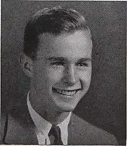 Bush enrolled at Yale College, where he took part in an accelerated program that enabled him to graduate in two and a half years rather than the usual four.[14] He was a member of the Delta Kappa Epsilon fraternity and was elected its president.[39] He also captained the Yale baseball team and played in the first two College World Series as a left-handed first baseman.[40] Like his father, he was a member of the Yale cheerleading squad[41] and was initiated into the Skull and Bones secret society. He graduated Phi Beta Kappa in 1948 with a Bachelor of Arts degree in economics.[42]
