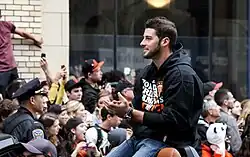 Due in part to a back injury suffered by Yankees catcher Austin Romine, the Yankees traded Kontos to the San Francisco Giants in exchange for catcher Chris Stewart before the start of the 2012 season.[21][22] He began the season with the Fresno Grizzlies of the Triple-A Pacific Coast League.[23] After starting the season with a 2–0 win–loss record and a 1.71 ERA in 23 appearances, the Giants promoted him to the major leagues on June 10.[24] Through August 14, he pitched to a 2.33 ERA and a 1.15 walks plus hits per innings pitched (WHIP) ratio in 26 games, becoming a reliable member of the Giants bullpen.[25] Kontos got his first major league win in relief of Barry Zito, successfully recording 7 outs without allowing a baserunner. The Giants went on to win the game 6–4 against the Astros. Kontos entered the postseason for a second straight season and won the 2012 World Series with the Giants in a four-game sweep of the Detroit Tigers.